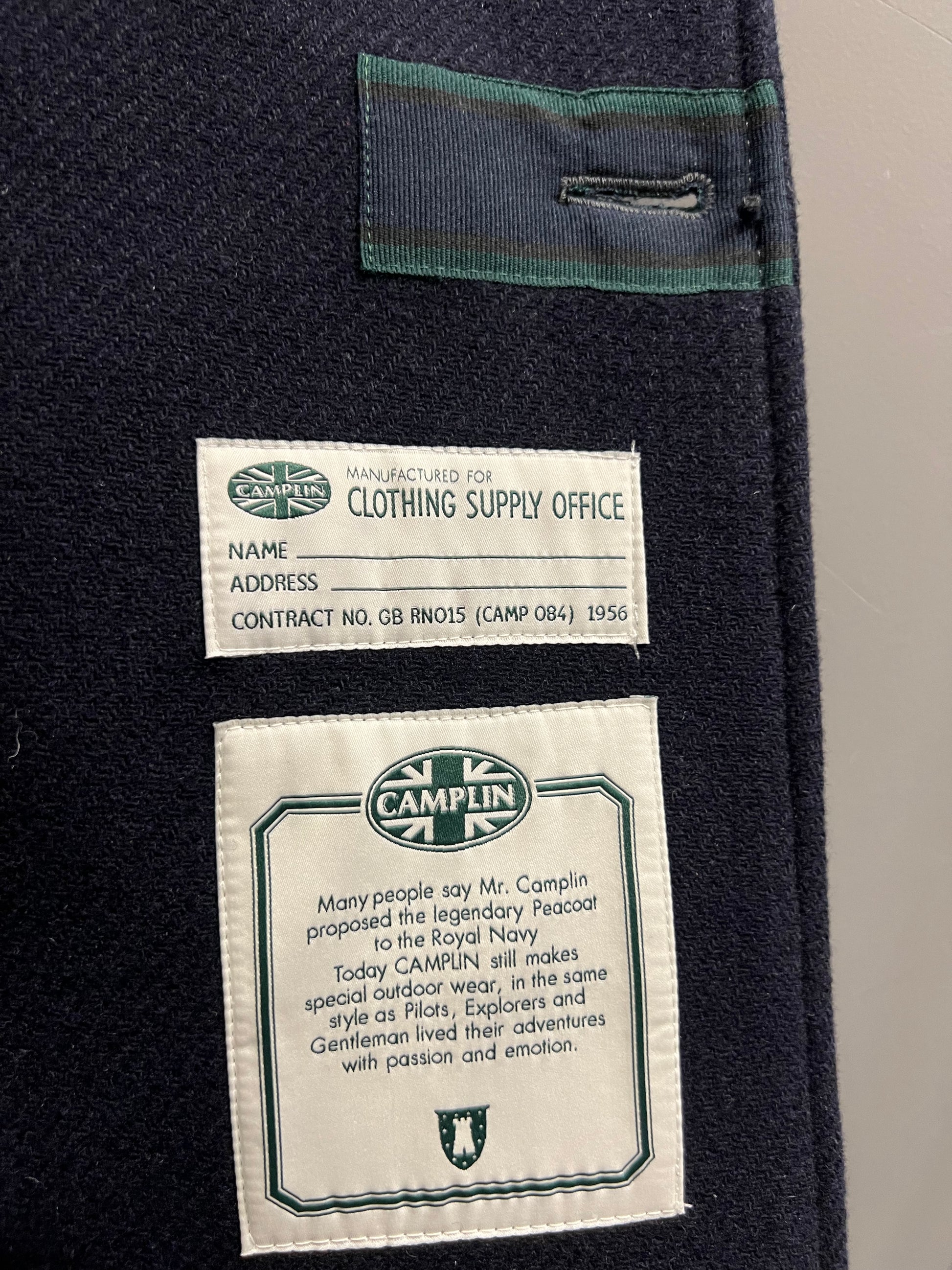Gli occhielli del doppiopetto sono rinforzati all’interno dal Gros-grain evocativo della medaglia General Naval Service.