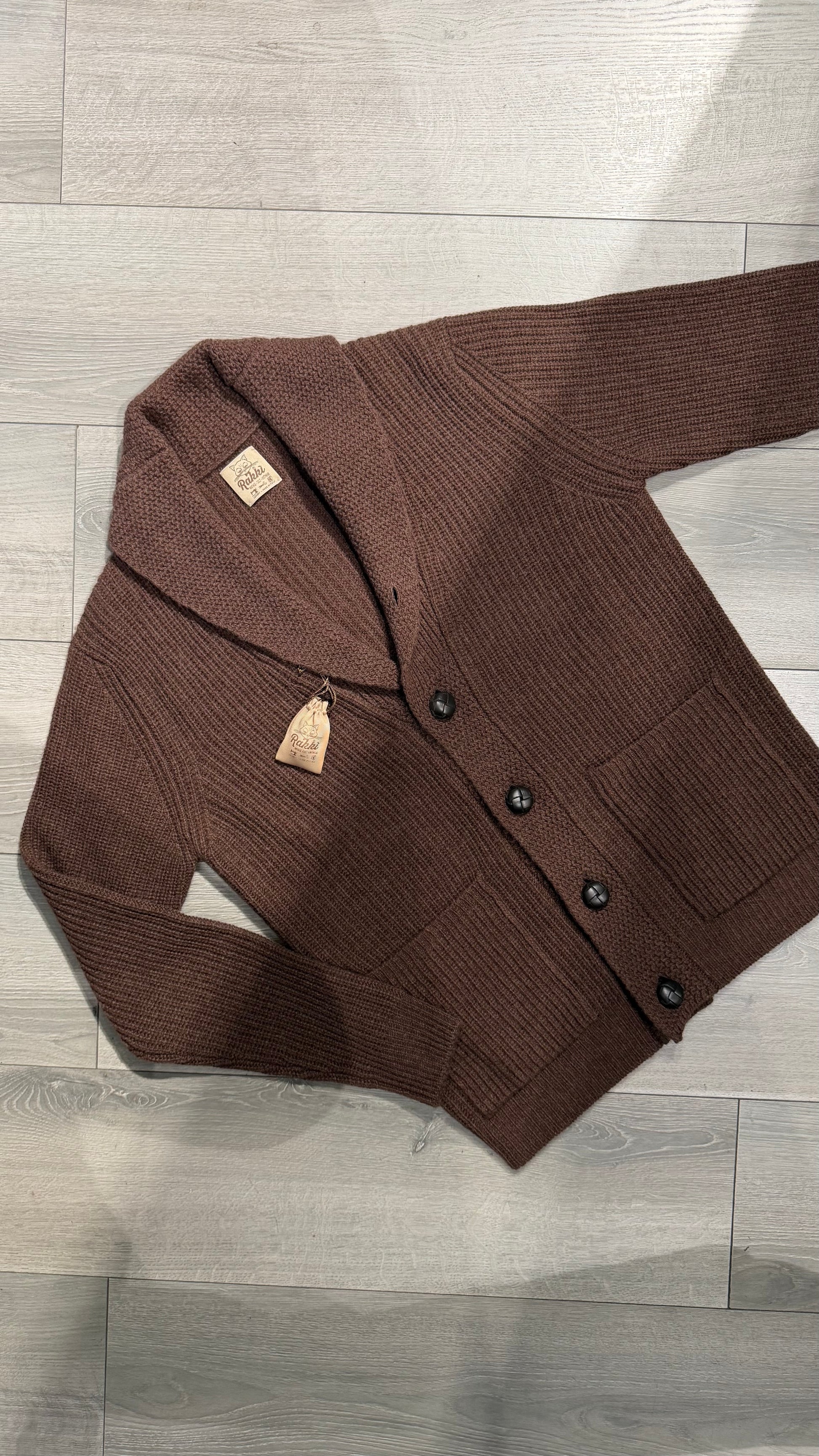 Cardigan con collo sciallato, tasche a toppa bottoni rivestiti in pelle